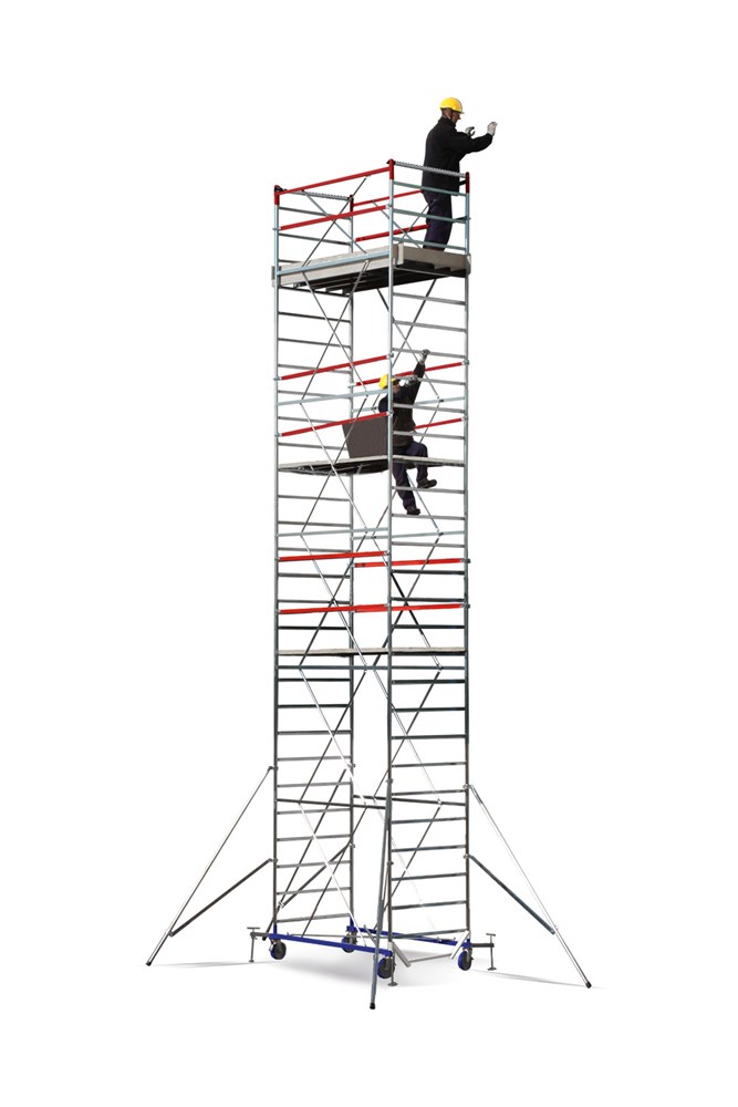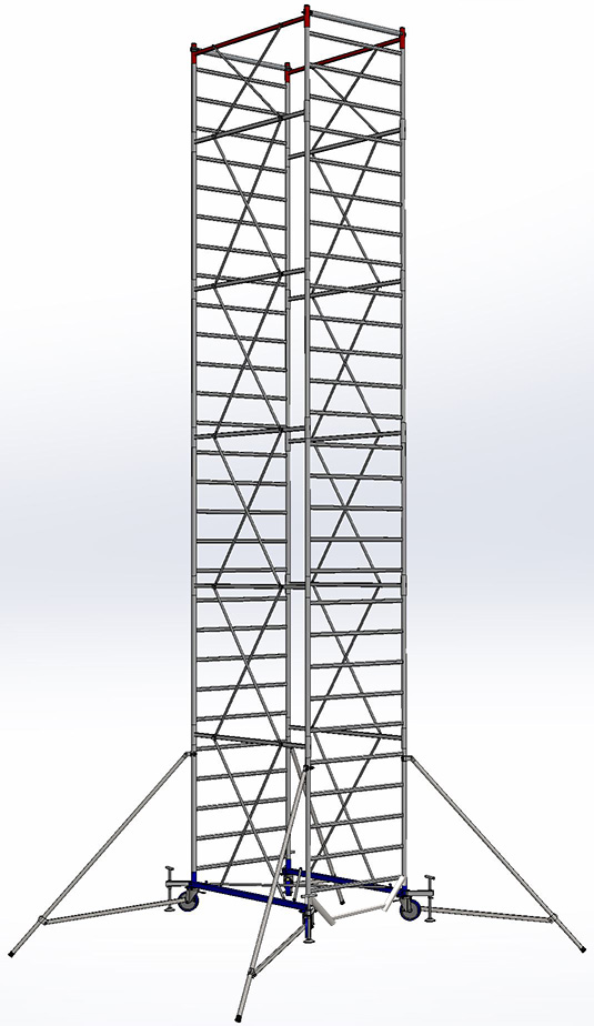 Компоненты имеют разные цвета, чтобы помочь оператору идентифицировать элементы для сборки и понять, правильно ли установлена вышка-тура: основание окрашено в синий цвет, а перила и ограждения — в красный.