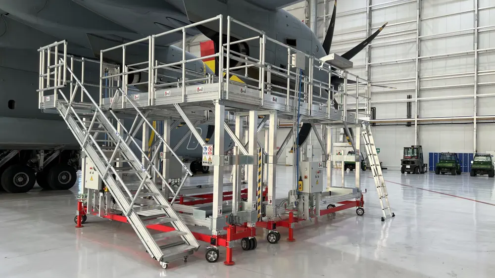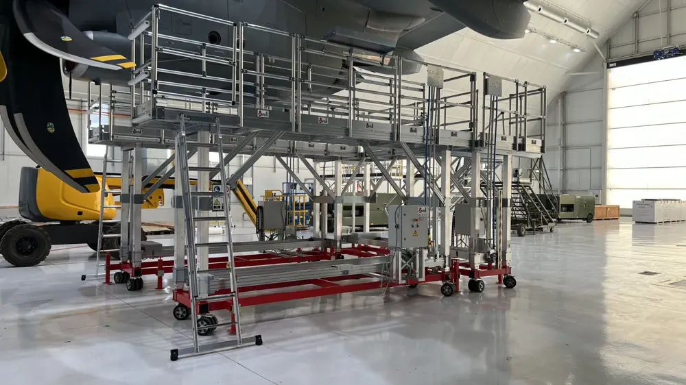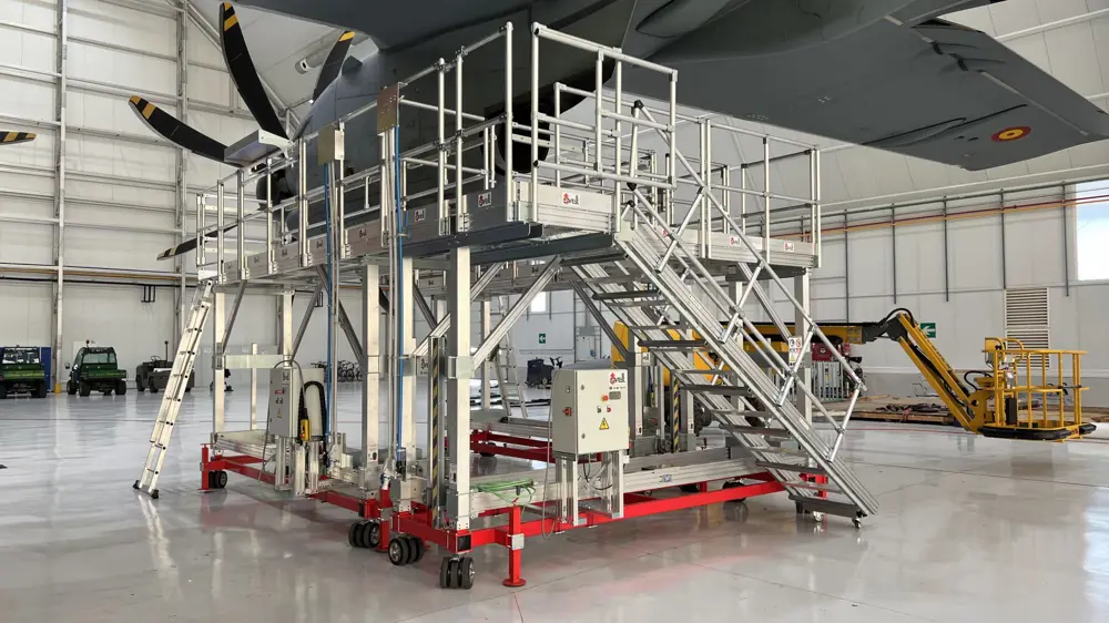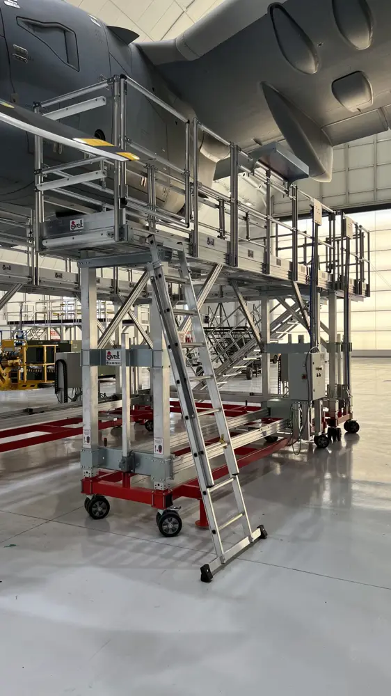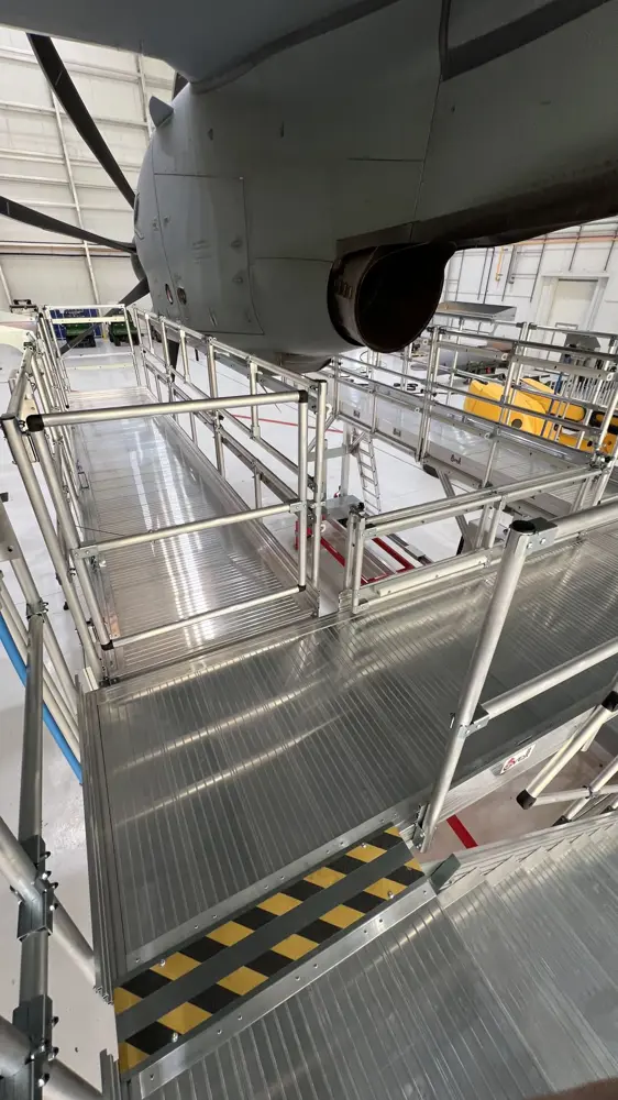 Специальные сооружения со стальным основанием и алюминиевой конструкцией, образующие различные пешеходные дорожки на разной высоте для обслуживания и строительства самолётов.