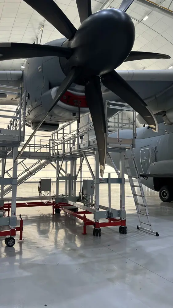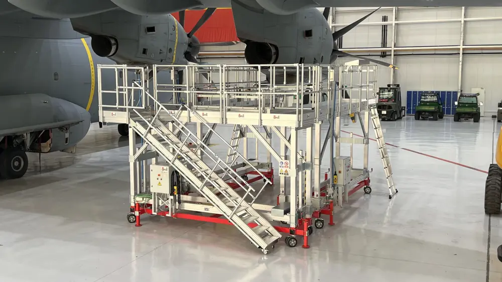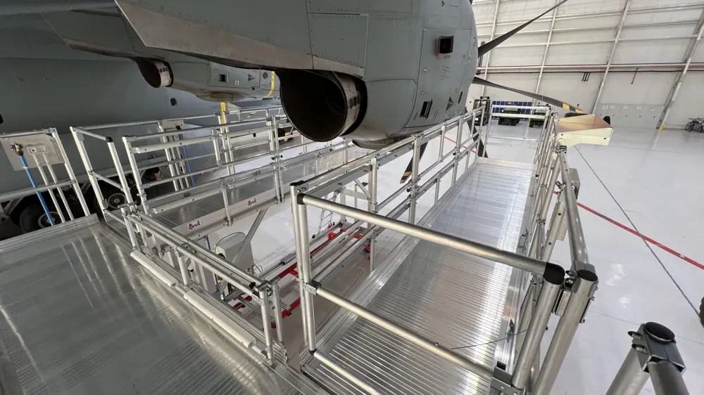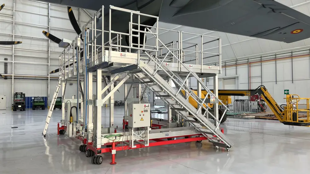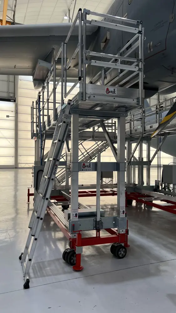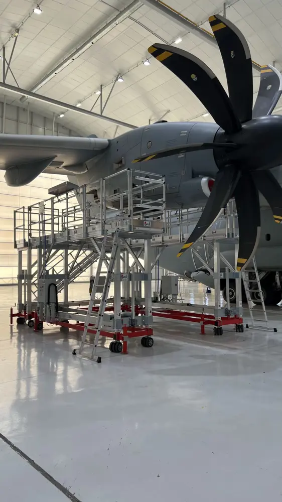 Специальные сооружения со стальным основанием и алюминиевой конструкцией, образующие различные пешеходные дорожки на разной высоте для обслуживания и строительства самолётов.