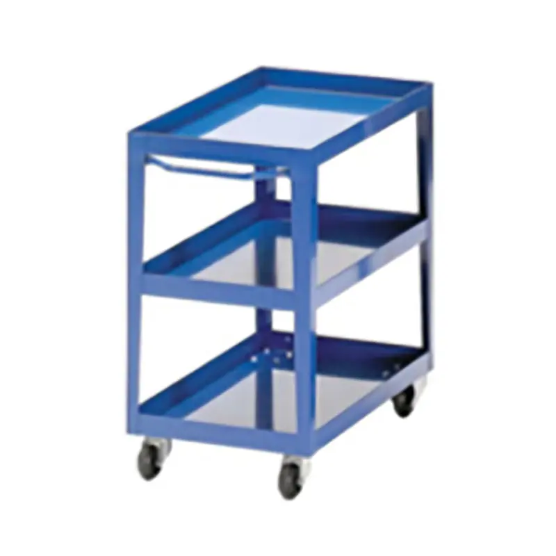Тележка из листовой стали с тремя полками 80x45 см, 4 сплошными колёсами (2 поворотных и 1 с тормозом), максимальная грузоподъемность 50 кг на платформе