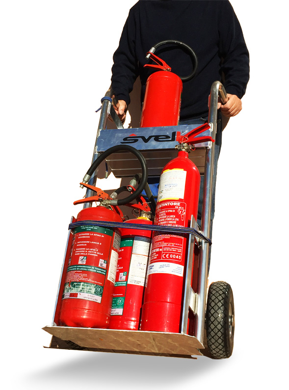 - Перевозка небольшого количества огнетушителей на ограниченных участках: в этом случае ручная тележка используется в вертикальном положении для перевозки не более 7 огнетушителей.до фургона, где проводится техническое обслуживание.