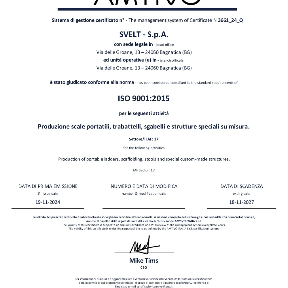 Сертифікація UNI EN ISO 9001, яку SVELT SPA отримала для своєї системи управління якістю, є важливим досягненням, яке не тільки підтверджує високий рівень ефективності, компетентності та організації, досягнутий компанією, але також є гарантією для клієнтів і зацікавлених сторін, що компанія приймає методи управління, засновані на визнаних міжнародних стандартах.