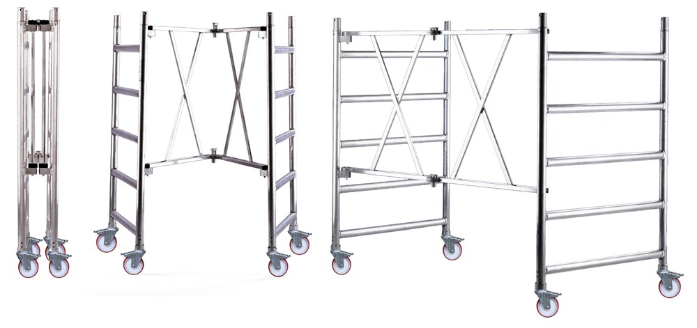 Виготовлено з легкого круглого алюмінієвого профілю ø 50 мм з нековзними рифленими сходинками. Базовий модуль попередньо зібраний, і досить простого руху, щоб відкрити його і встановити для роботи. Невелика кількість компонентів забезпечує легкість, транспортабельність та просте складання за кілька хвилин і без використання інструментів. Не іржавіє.