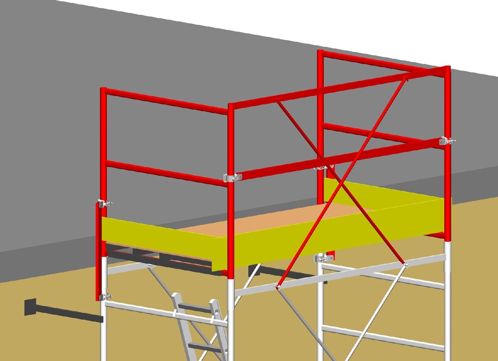 - Компоненти мають різні кольори, щоб допомогти оператору ідентифікувати елементи для монтажу та зрозуміти, чи правильно встановлена вишка-тура: основа синя, а перила та огородження — червоні.