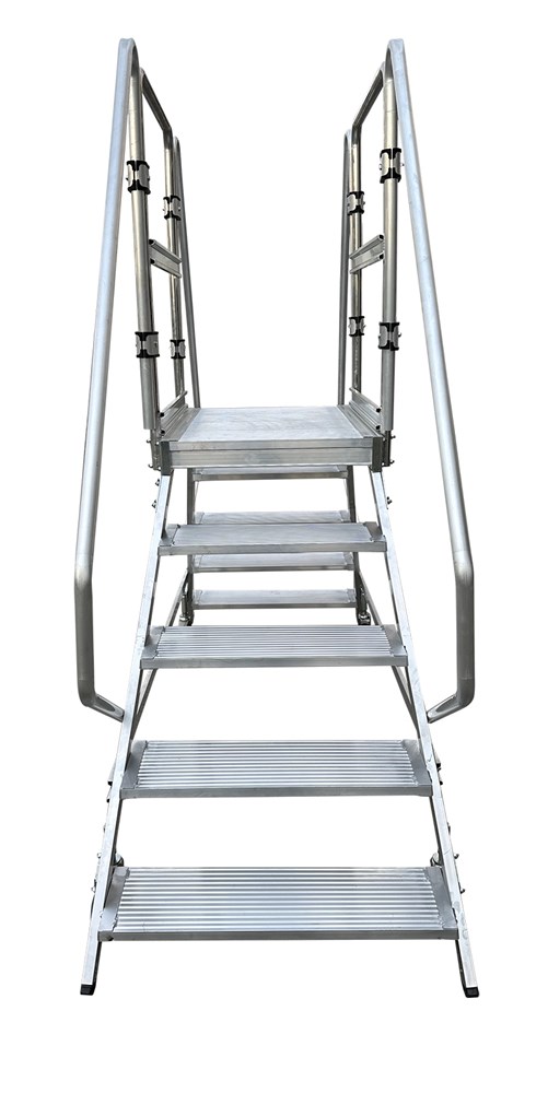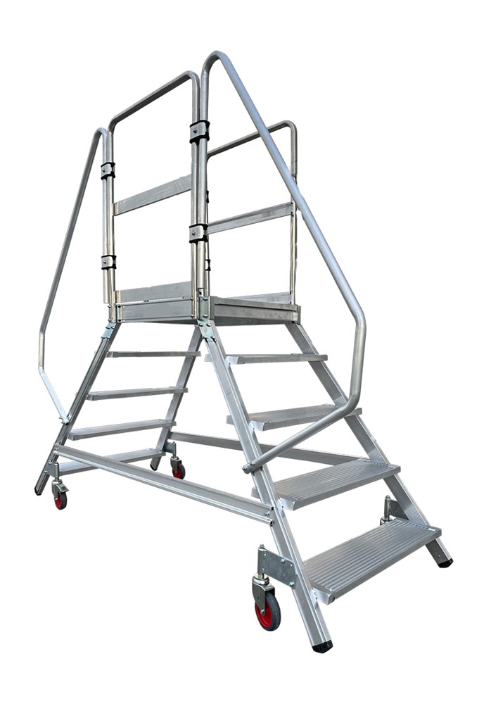 Драбина з платформою має великі плоскі сходинки, поручні, високі огородження 91 см, колеса.