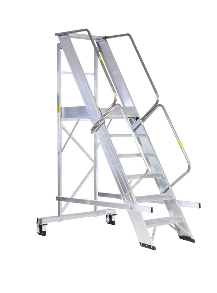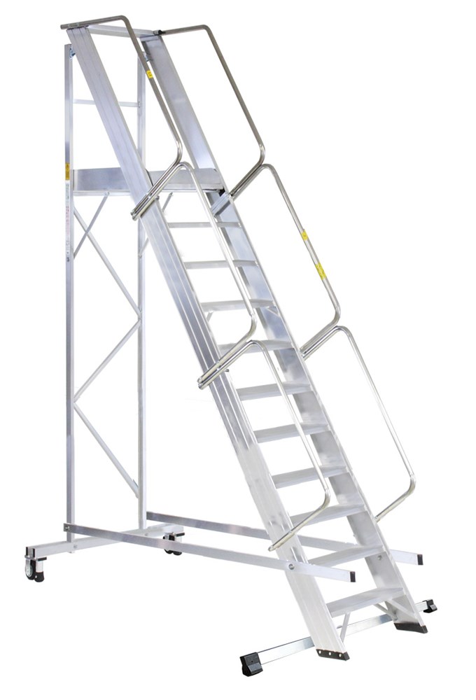 Драбина з платформою має збільшені сходинки для одностороннього підйому, збільшений майданчик, огородження та ергономічні поручні.