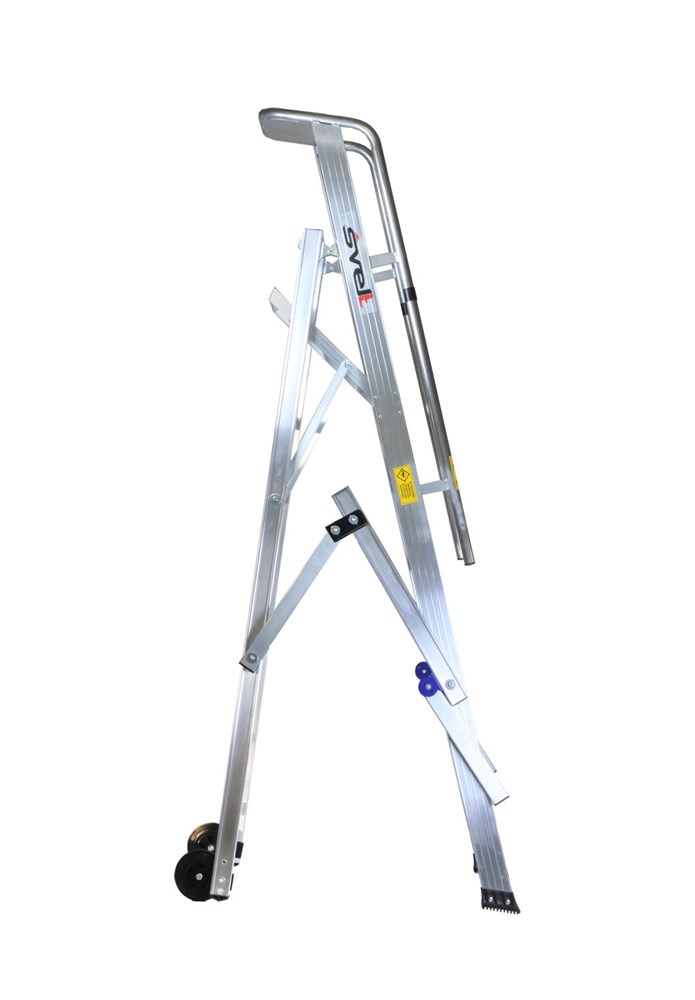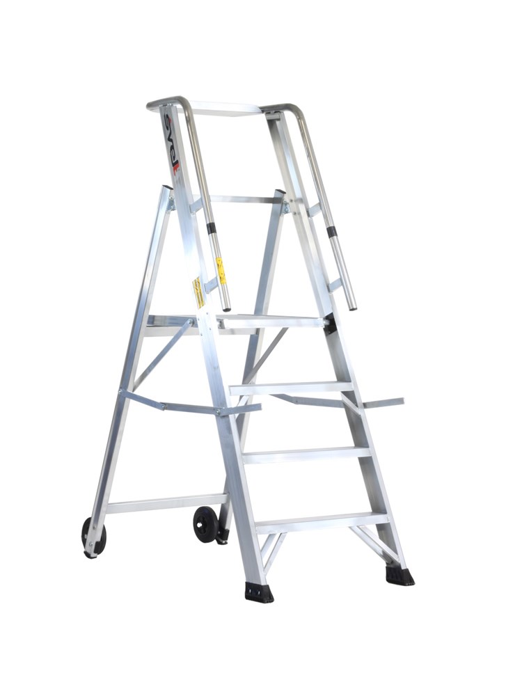 Односторонна алюмінієва драбина з великою платформою, оснащена двома роликами, лотком для інструменту та поруччями.