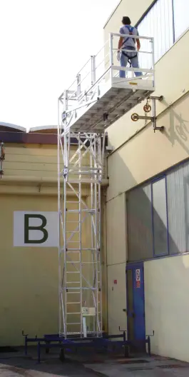 Пофарбований сталевий каркас підтримує ребристу алюмінієву колону з алюмінієвою платформою в комплекті з парапетами, які відкриваються з усіх боків.