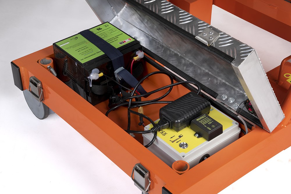 - Оснащений акумулятором 12 В з автоматичним зарядним пристроєм на 6 Ач