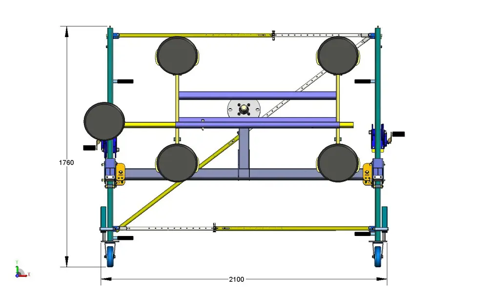 Після фіксації вони будуть з’єднані телескопічними хрестовинами, які створюють несучу конструкцію підйомника, запобігаючи роз’єднанню двох половин і дозволяючи піднімати та перекидати скло, яке в цей момент підтримуватиметься колесами.