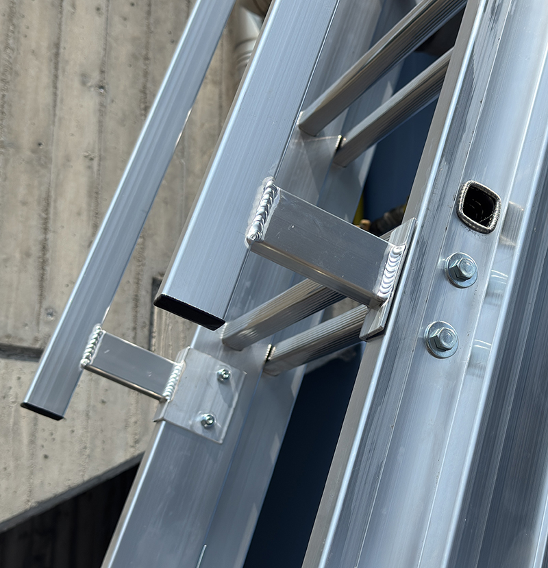 Вона також зосереджена на міцності, досягаючи значних висот (5 і 7 м). Отже, профіль його вертикальних опор має розміри 84 x 27 мм. За запитом драбина може бути оснащена стабілізатором біля основи для більшої стабільності та підвищення безпеки, а також поручнями для кращого зчеплення операторів при доступі до підлоги зверху.
