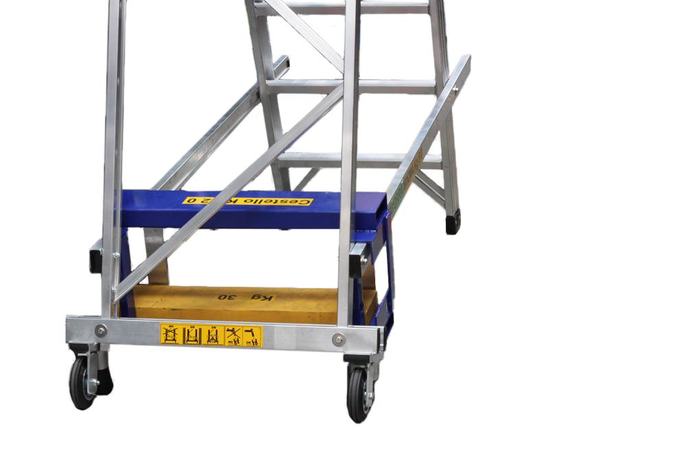 Надкомпактна драбина з платформою спеціально розроблена для вузьких коридорів складів, супермаркетів, складських центрів, де зазвичай використовуються вузькі, але не збалансовані і тому небезпечні драбини.
