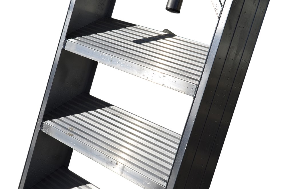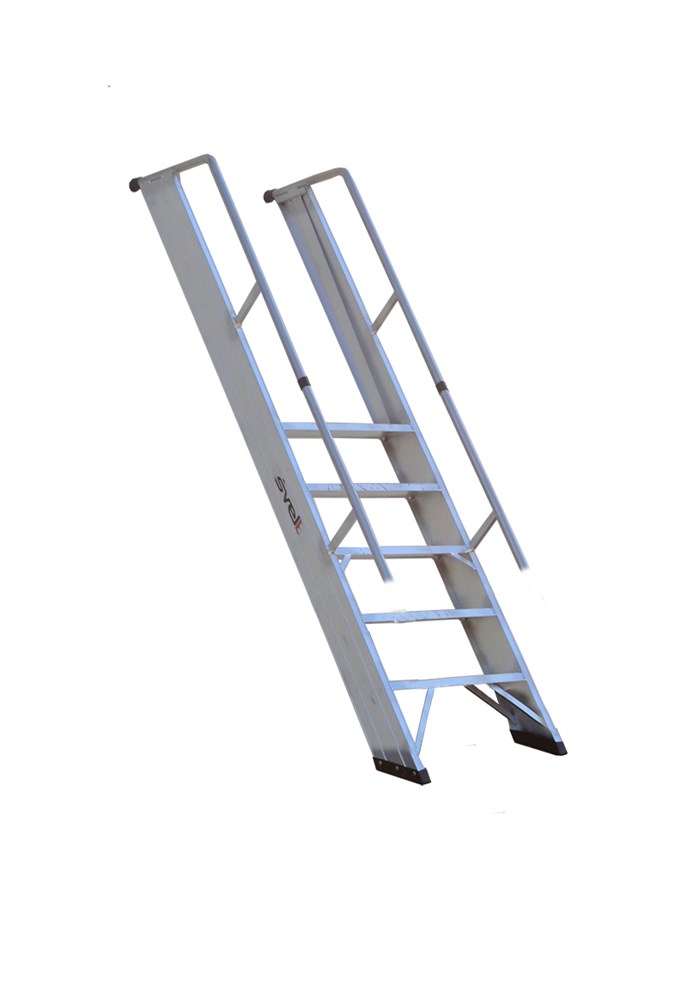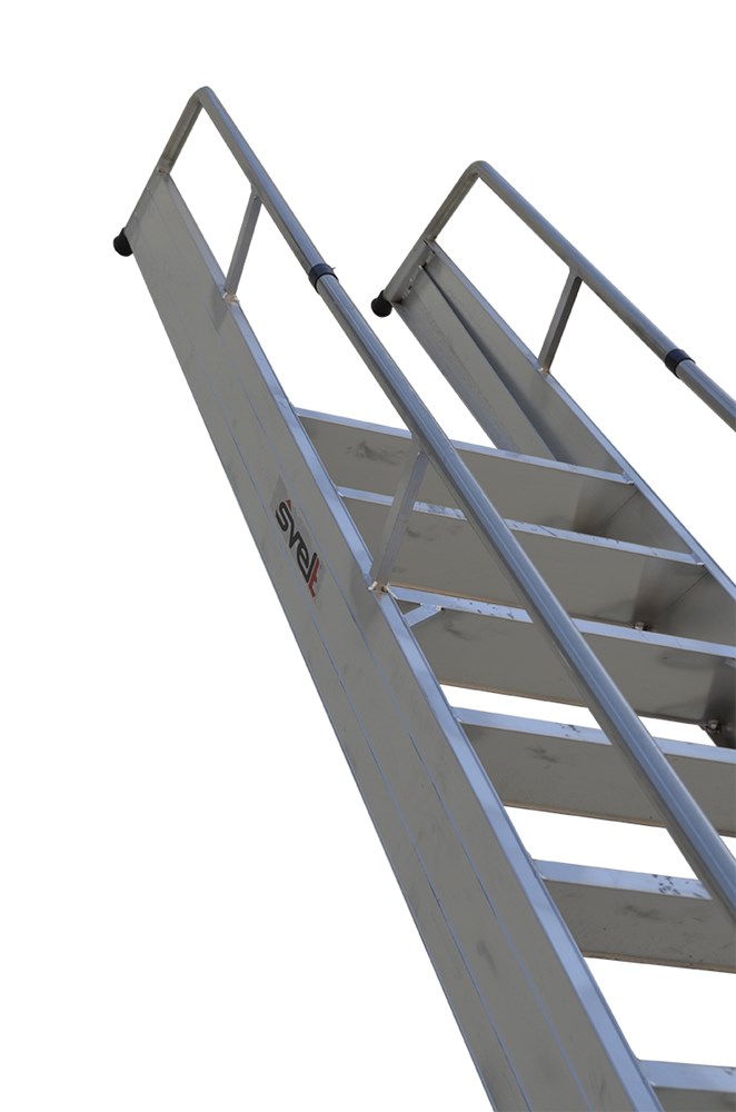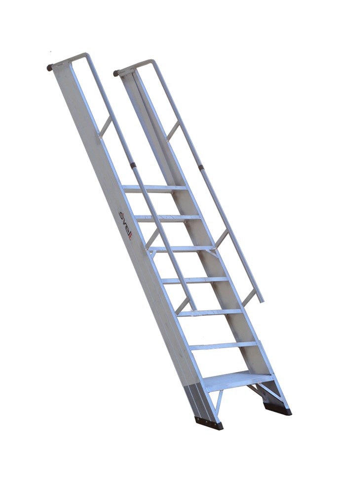 Проста приставна драбина зі сходинками, привареними до стійок. Виготовлена з екструдованого алюмінію.
