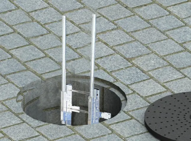 Закріплюватися на стіні всередині колодязя або люка, з запобіжною кліткою чи без неї. Оснащений висувними ручками посадки